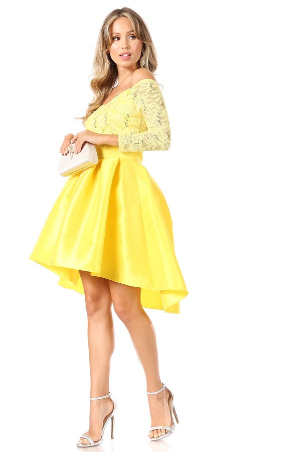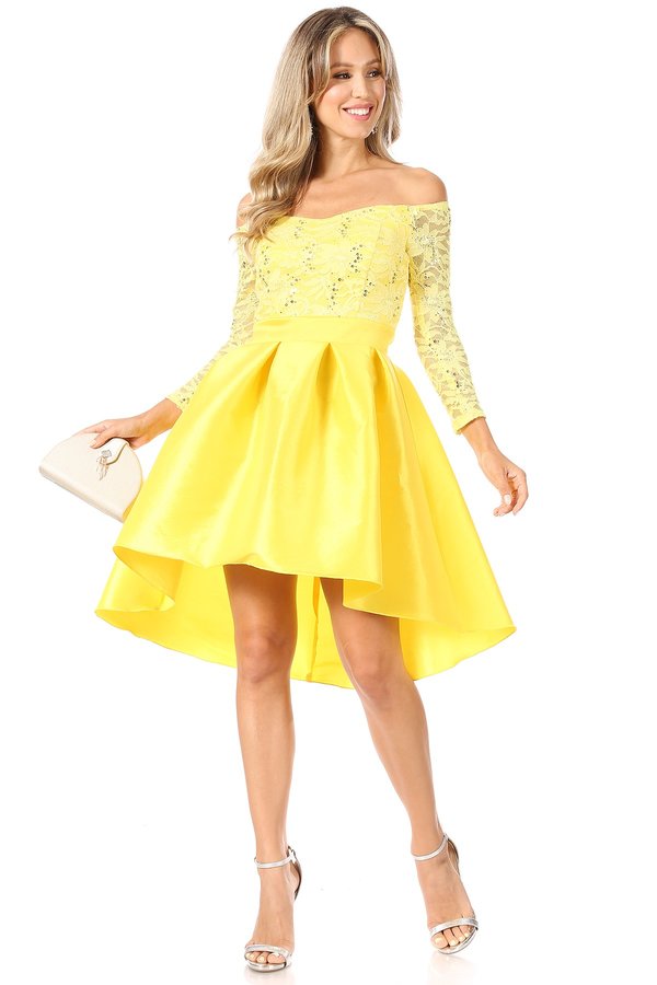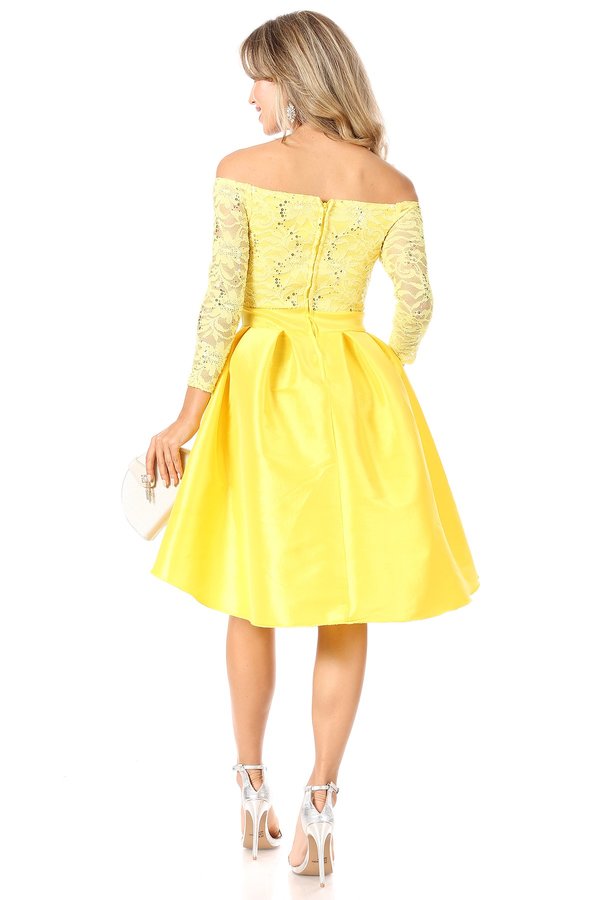 Short, off-shoulder lace / taffeta dress with long sleeves